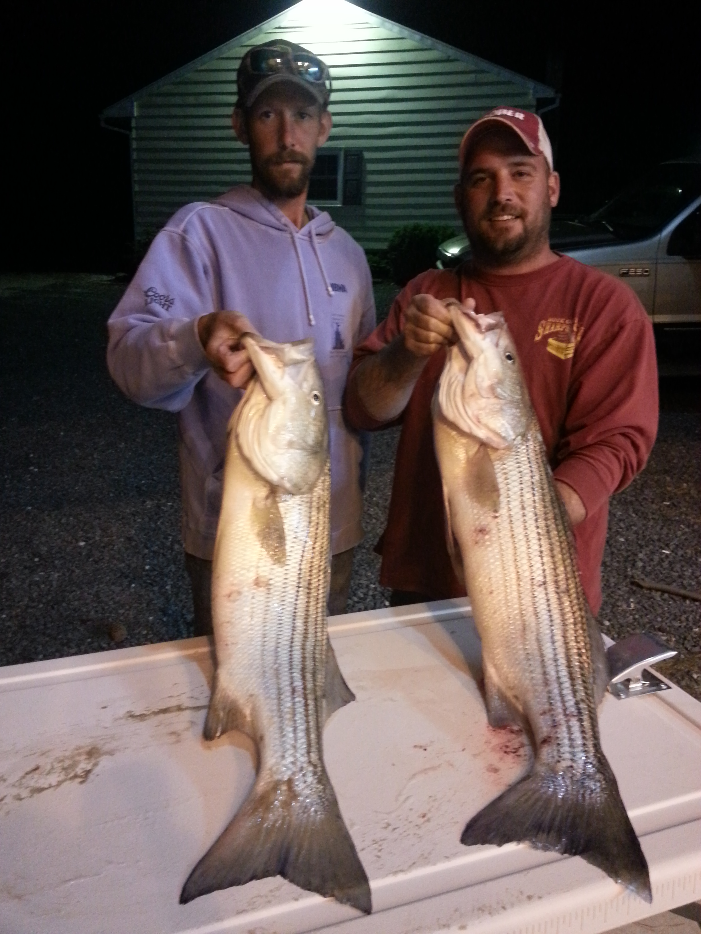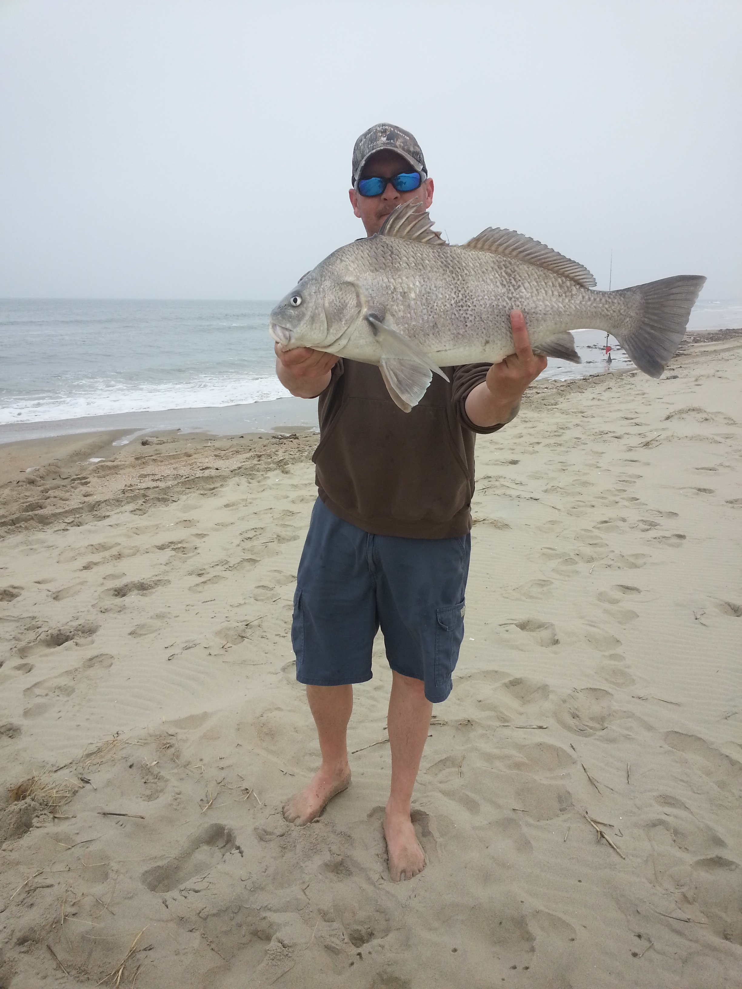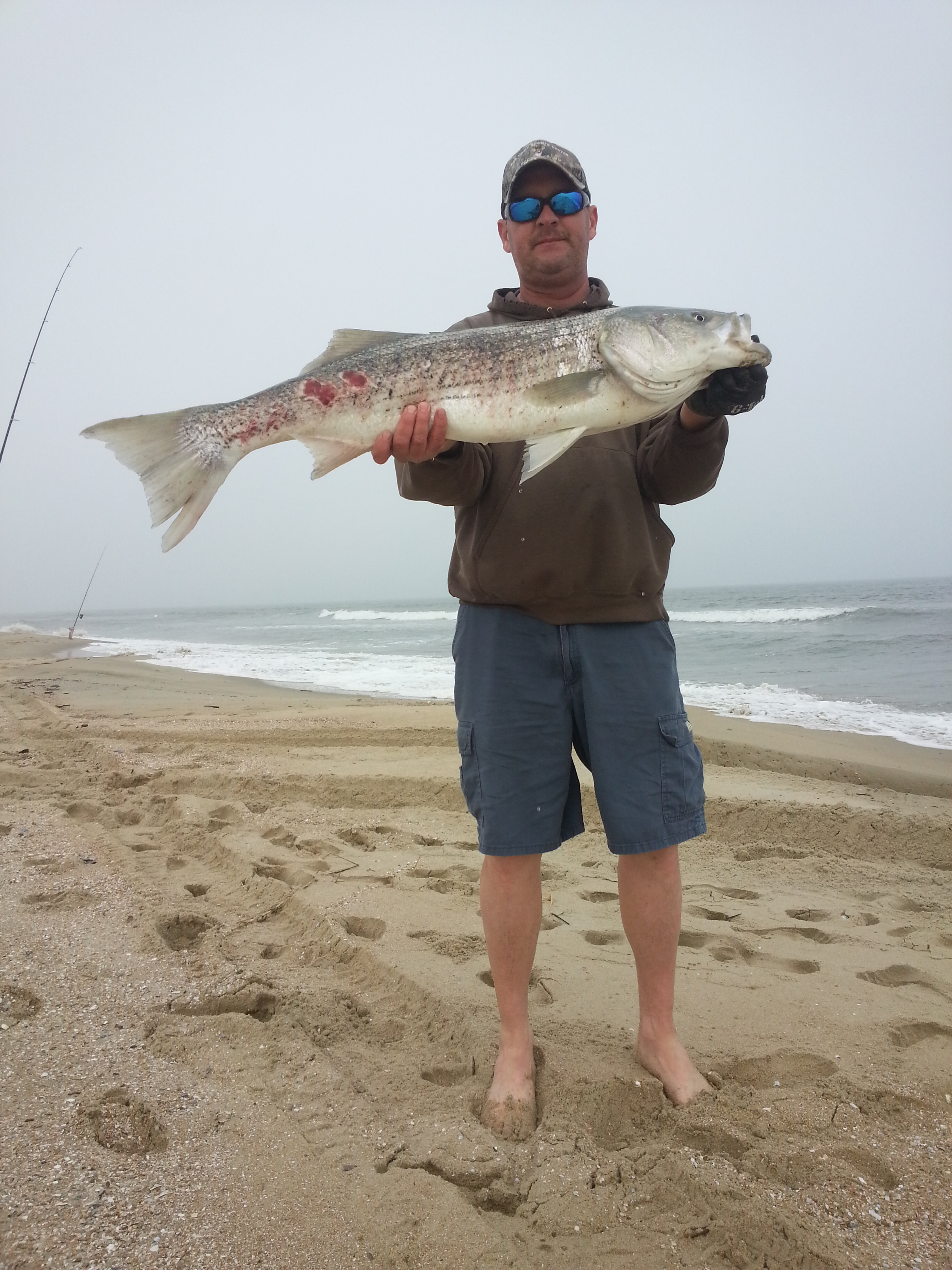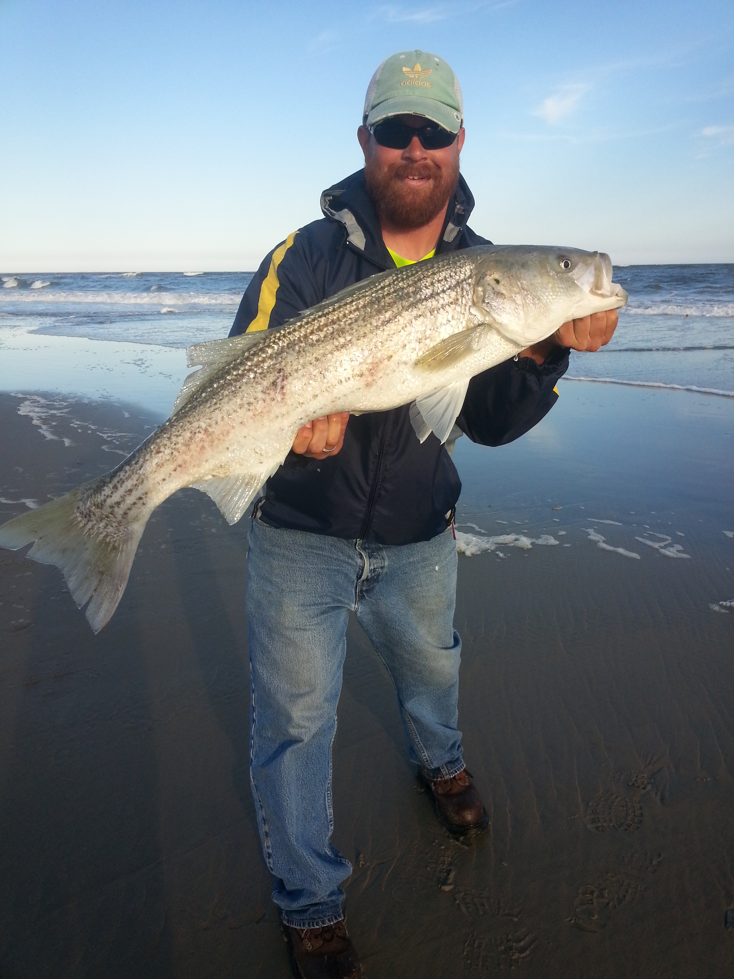 ![A Virginia trophy season rockfish from the surf, with a tag!]()