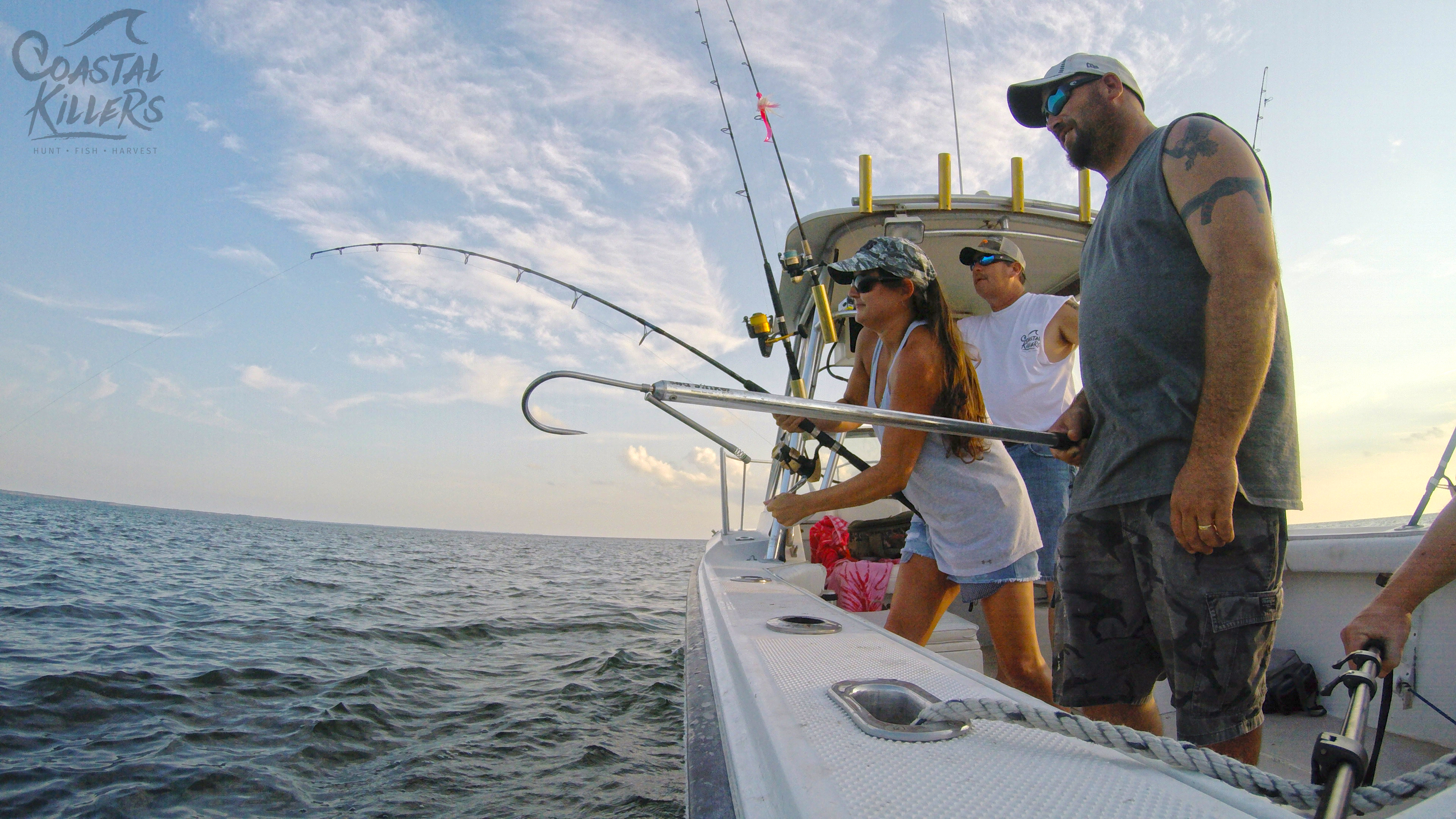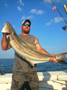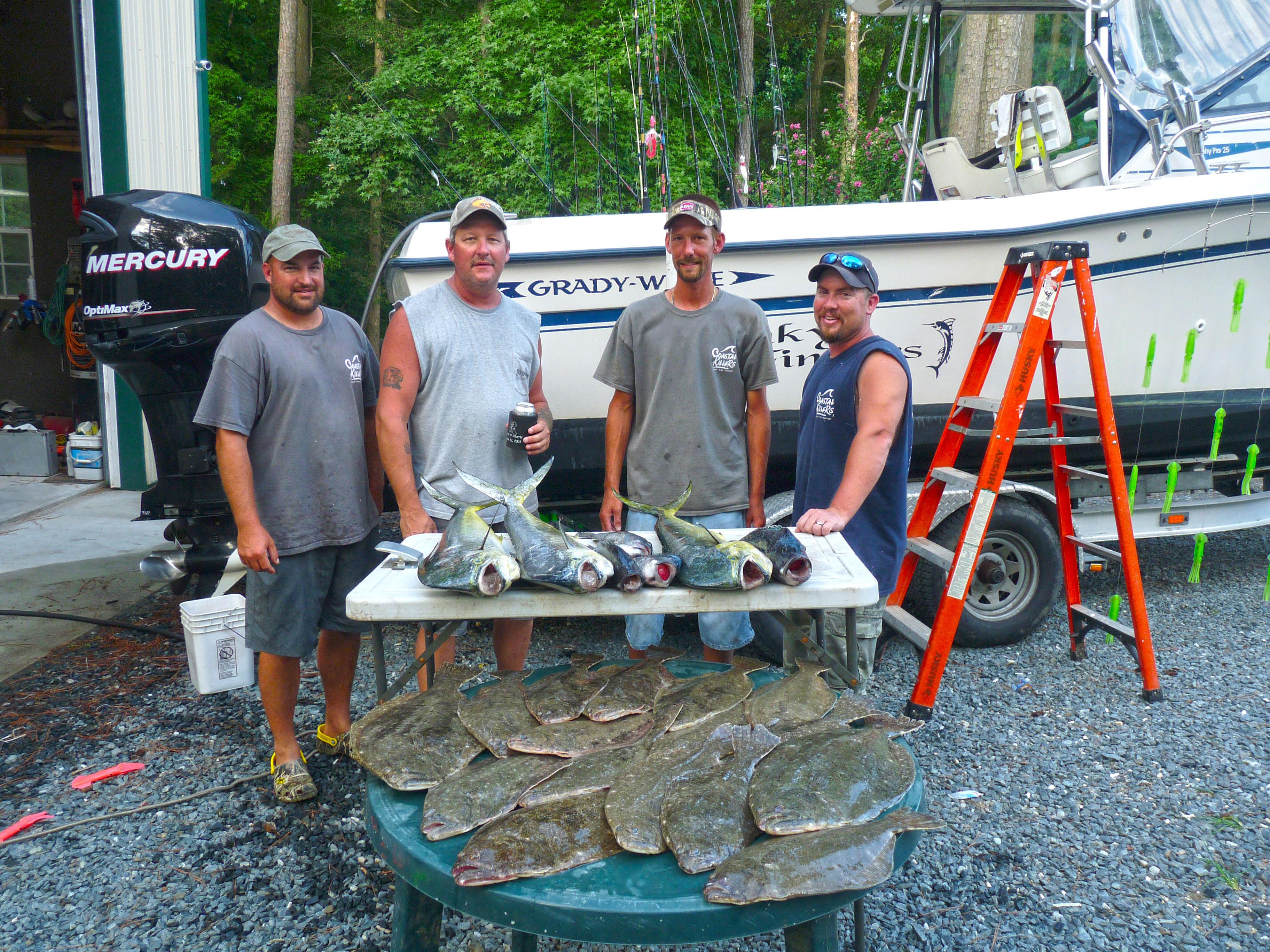 Its HOT summertime, a great time to be offshore and not sweltering in the heat on land. Fish get hot too, the flounder that come spawn inshore during the spring are now rolling to the deep water in the ocean. Below the thermocline (about 20-40ft down) the water stays a cool 50ish degrees or so year round. Just like us in the summer, they want to escape the heat! The past two weeks we have done a mix of trips. Offshore trolling with a bit of flounder fishing, then flounder fishing with a bit of offshore trolling! Also slipped to the Chesapeake bay side to Cobia fish, the cobes are at their northernmost range right now (in our backyard 🙂