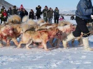 The sled dogs in Greenland I think are treated a little rougher than the ones you see on tv in Alaska. These dogs are born and bred to work, they are not pets, they seem half wild and the do not have an easy life, at all. But, they know their job and do it well. We headed down to the race about noon, saw all our Greenlandic buddies gearing up, they seemed in better shape headache wise than us… The race went off on time, about 18 teams participating, a good turnout considering how remote we were. A young guy won it, who has also won it at least 3 out of the last 5 years. First place was a new rifle and scope, not a bad deal!