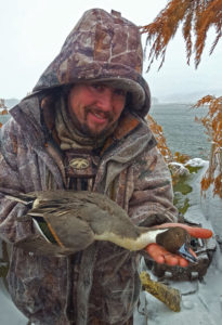 “I’ll be damned” he said “he’s gonna do it again.” Now, no duck in their right mind comes back to a spread after being cracked. Here was a pintail breaking all the duck rules. Fighting through the wind he peeled back in from his 200 yard detour. He wanted me, I wanted him, that is the plain and simple as I figure it. This time he came from the back side, but we were watching. It didn’t take a call to shoot this time, the mighty sprig came slowly into range. He was not concerned with the decoys, he wanted to be close to the cedars and close to me, in he came. The single crack from the Benelli hit true. I do not think I even pumped the empty shell out. He fell at the base of the blind with a soft landing in the snow. Not a feather damaged as my guide pulled him from the marsh. A perfect looking bird, the high and mighty drake pintail was mine after all these years. We were twenty minutes into the hunt.