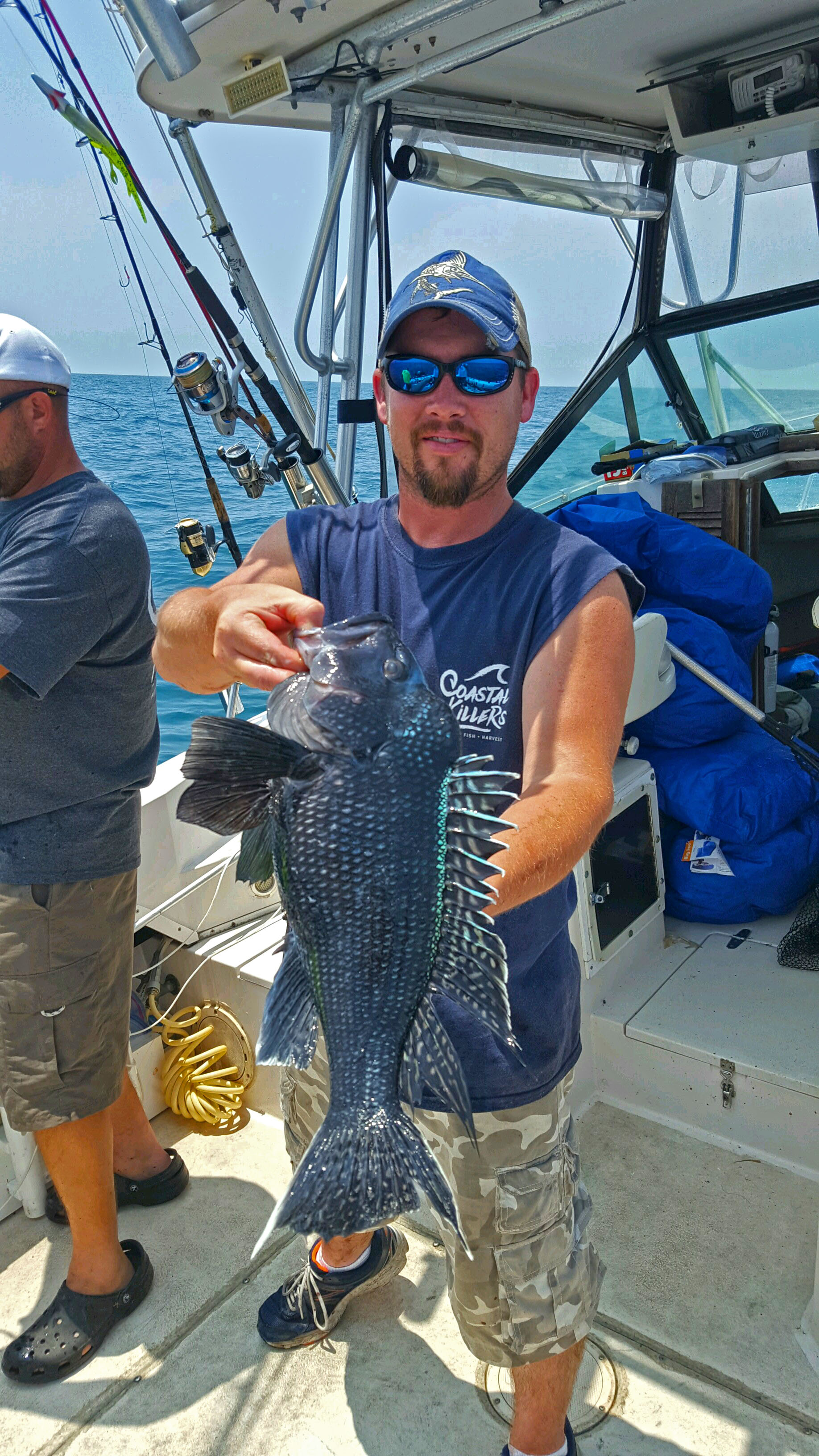 With a slower bite in the afternoon we decide to pull lines and hit a wreck for a few sea bass on the ride in. As we are pulling lines the ocean turns into a mass of hammerhead sharks. Looking around I bet we see a dozen finning all around us. Not sure what had them concentrated in such a small area, but you know we just can’t leave them alone. Out comes the big spinning rod and a half bunker on wire leader. 7’ hammerhead hooked up! I actually fought him for a while until I got tired of him beating my ass, passed him off and took some cool video. The ride in was like a minefield, I have never seen so many sea turtles in my life. For a stretch of about 8 miles there were turtles everywhere. I bet we could have counted over 100, it looked like crab pots in Pocomoke sound… Busted the bass on the way in, they sure do eat good.